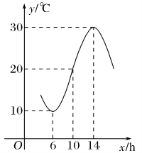 答案:y=10 \sin \left(\frac{\pi}{8} x+\varphi\right)+20 ;~~~~~~~~~~~~~~~~~~~~~~~~~~~~~~~~~~\\提示:周期 T=16, A=10, b=20 . \therefore \omega=\frac{\pi}{8}, ~~~~~~~~~~~~~~\\ \therefore y=10 \sin \left(\frac{\pi}{8} x+\varphi\right)+20,又图象经过 (6,10),~~~~~~~~~ \\\therefore \sin \left(\frac{3}{4} \pi+\varphi\right)=-1,|\varphi|<\pi, \therefore \varphi=\frac{3}{4} \pi . \therefore 函数的~\\解析式为 y= 10 \sin \left(\frac{\pi}{8} x+\frac{3 \pi}{4}\right)+20, x \in[6,14] .~~~~~~~